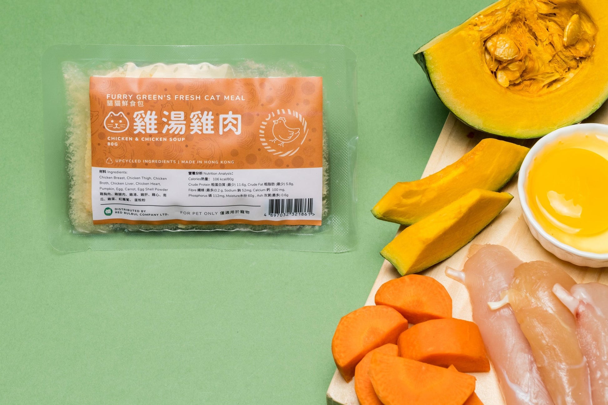 Chicken Breast, Chicken Thigh, Chicken Heart, Chicken Liver, Egg, Pumpkin, Carrots, Chicken Broth, Egg Shell Powder, Taurine, Wheat Grass Powder, Salmon Oil, Kelp Powder